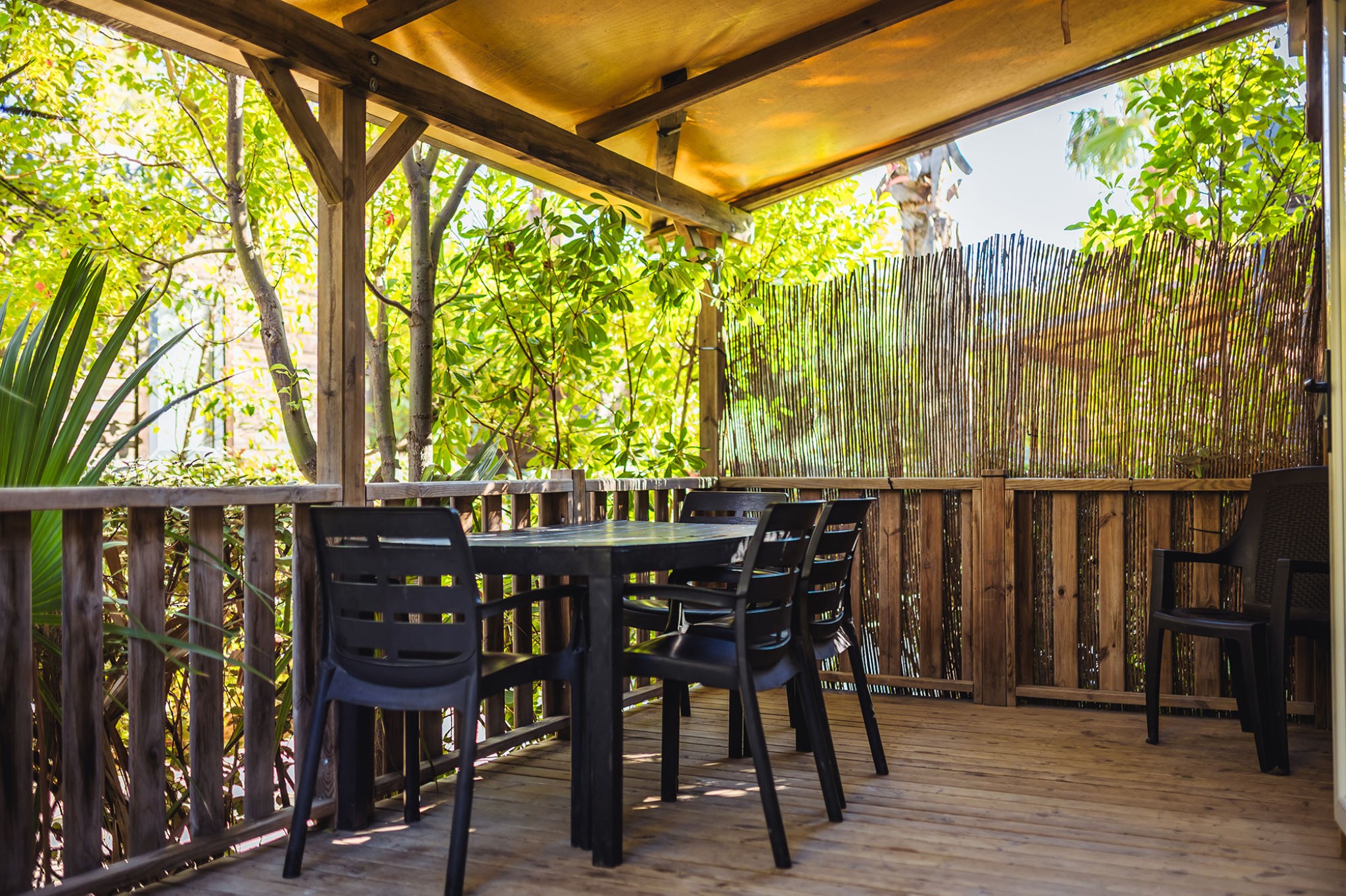 Ouderwets kamperen en de toerist uithangen in St-Tropez zijn passé. Het is tijd voor de lodge-ervaring! Comfortabel geïnstalleerd in uw design salon laat u uw gedachten heerlijk de vrije loop terwijl u door de grote raampartij uitkijkt over hectares bos waar de zonnestralen spelen met het groen. De warme uitstraling van de houten wanden en meubels wordt nog eens versterkt door de vrolijke kleuren van de aankleding.
