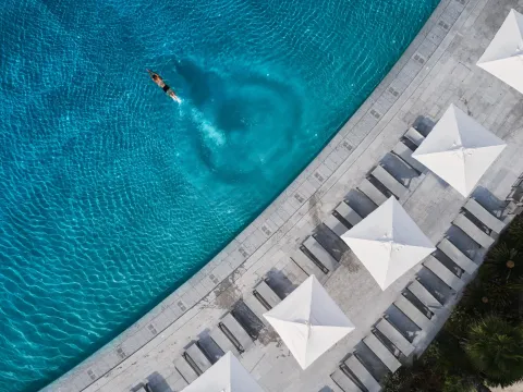 Ontdek ons zwembad bij Prairies: 2 verwarmde zwembaden met een kinderbad en een enorm zandstrand om te ontspannen.
